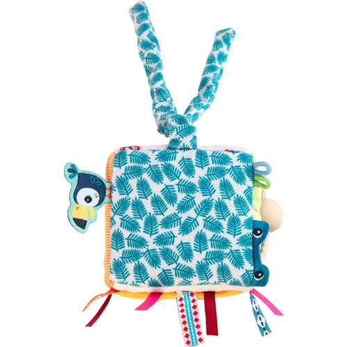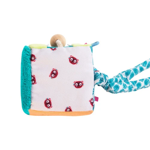 Ontdek de activiteiten en verhaaltjes van deze zachte kubus rond het junglethema. De bijtring biedt verlichting bij doorkomende tandjes.Stimuleert de zintuigen, fijne motoriek en het vastpakken. 8x8x8 cm.