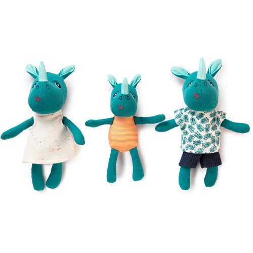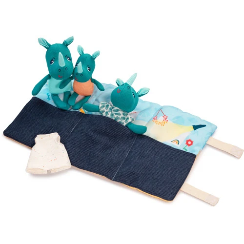 Wat een schattig neushoorngezin deze familie van Marius van Lilliputiens. Het matje en de figuurtjes kunnen gemakkelijk overal mee naar toe genomen worden. Zo kan de kleine telkens weer nieuwe avonturen beleven met deze speelset. De kleertjes van de poppe