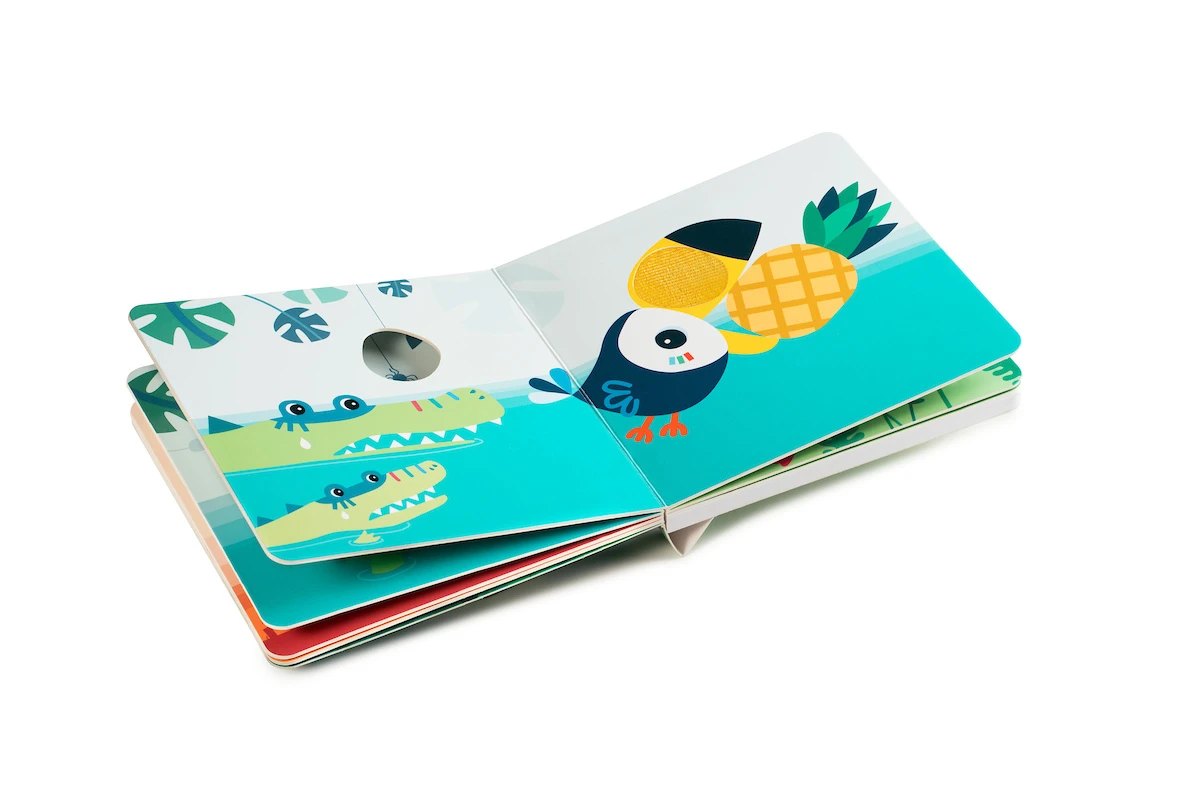 Vertel met dit mooi geïllustreerde kartonnen boekje boordevol geluiden jullie eigen jungleverhaal. Benoem de dieren en herken de geluiden. Stimuleert het gehoor, de tastzin en de verbeelding.