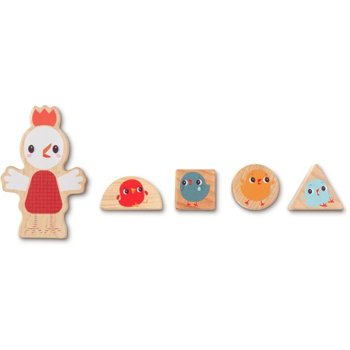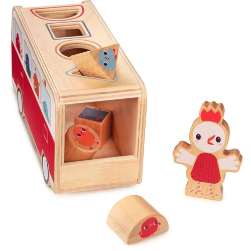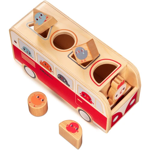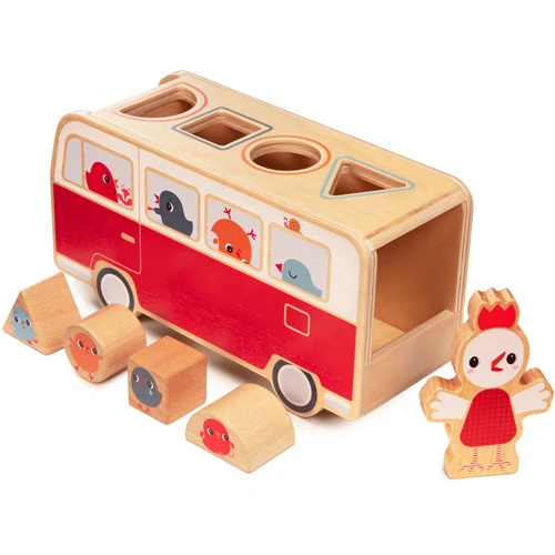 Paulette van Lilliputiens heeft geen tijd vandaag, ze brengt namelijk met deze vormsorteerder in de vorm van een houten bus haar kuikentjes naar school. Goede oefening voor vorm- en kleurherkenning.